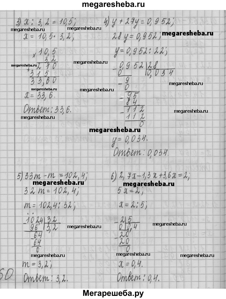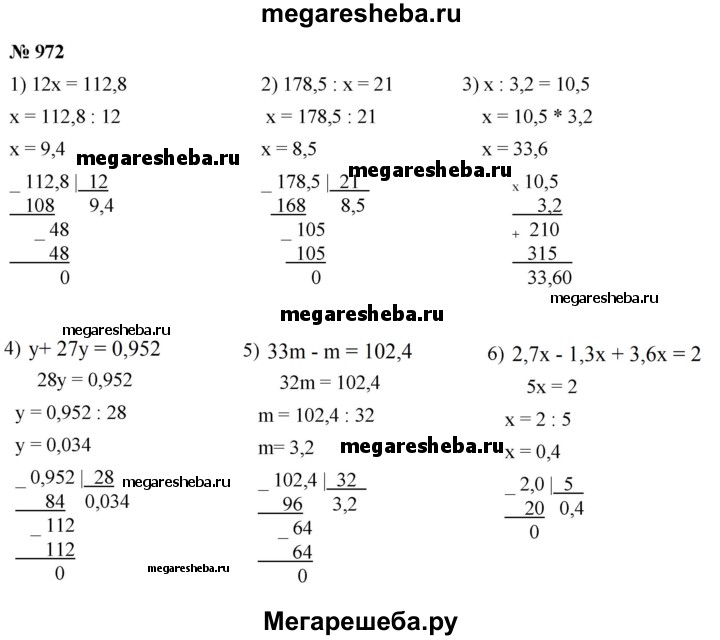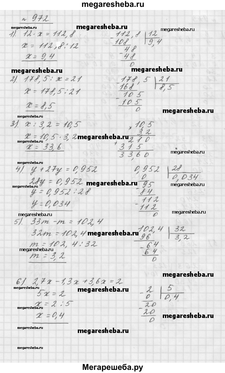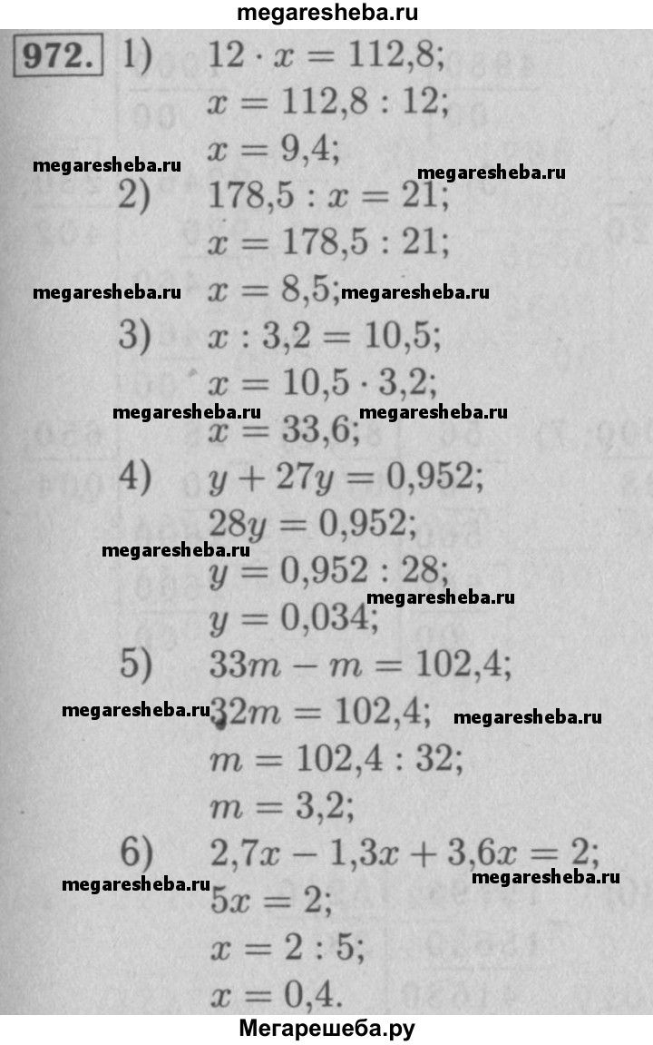 972. Решите уравнение: 1) 12 • x= 112,8; 2) 178,5 : x= 21; 3) x : 3,2 = 10,5; 4) у + 27у = 0,952; 5) 33m - m = 102,4; 6) 2,7 x - 1,3 x +3,6 x =2.