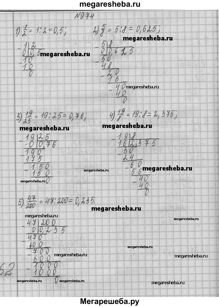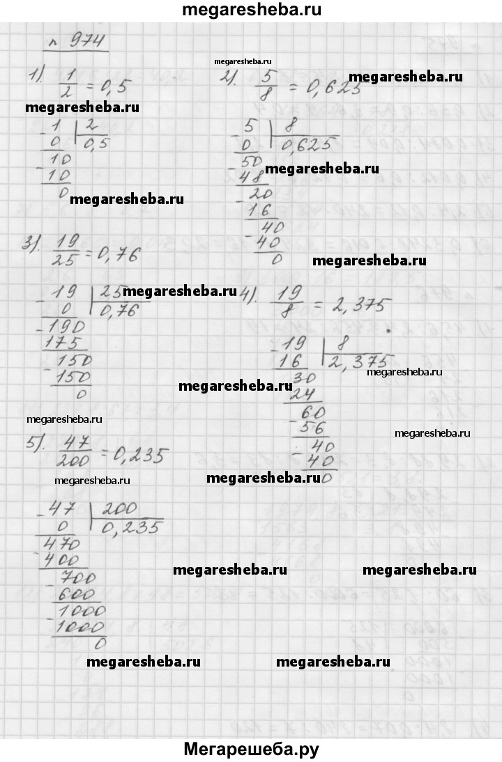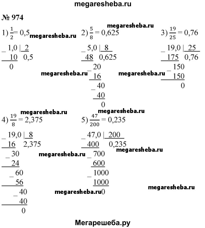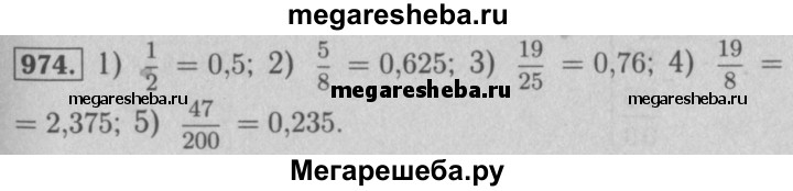 974. Преобразуйте в десятичную дробь: 1) 1/2; 2) 5/8; 3) 19/25; 4) 19/8; 5) 47/200.