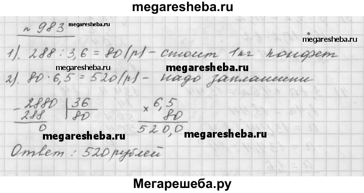 983. За 3,6 кг конфет заплатили 288 р. Сколько рублей надо заплатить за 6,5 кг таких конфет?