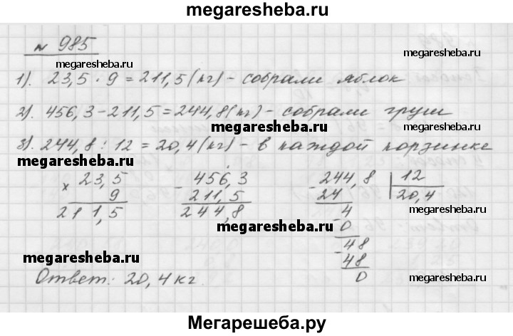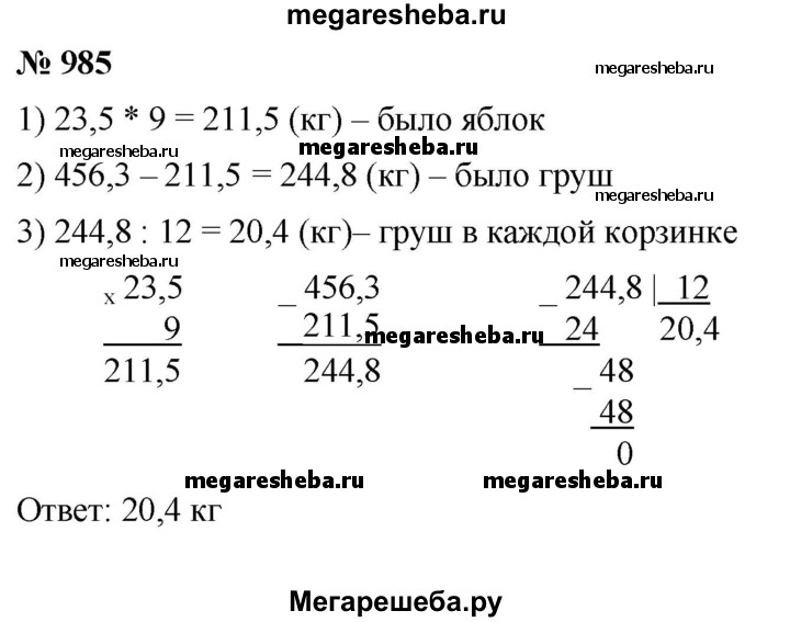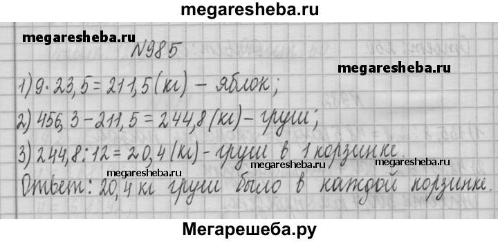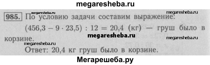 985. Собрали 456,3 кг яблок и груш. Яблоки разложили в 9 ящиков по 23,5 кг в каждый, а груши — поровну в 12 корзинок. Сколько килограммов груш было в каждой корзинке?