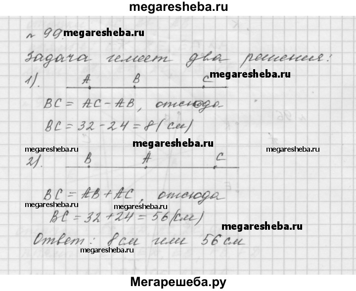 99. Точки А, В и С лежат на одной прямой. Найдите длину отрезка ВС, если АВ = 24 см, АС = 32 см. Сколько решений имеет задача?