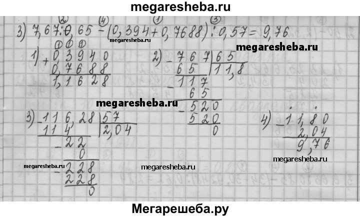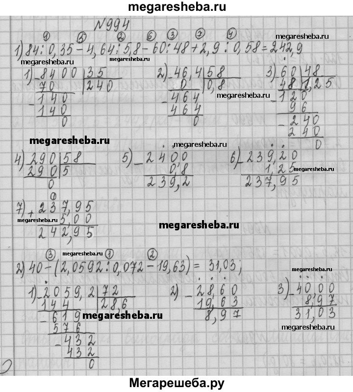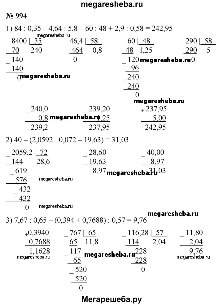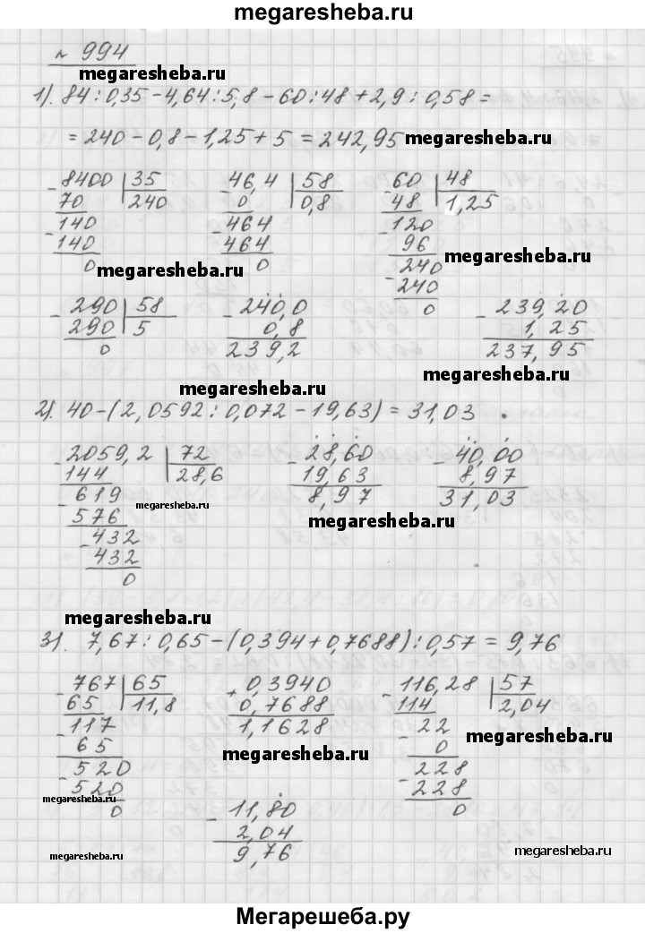 994. Найдите значение выражения: 1) 84 : 0,35 - 4,64 : 5,8 - 60 : 48 + 2,9 : 0,58; 2) 40 - (2,0592 : 0,072 - 19,63); 3) 7,67 : 0,65 - (0,394 + 0,7688) : 0,57.