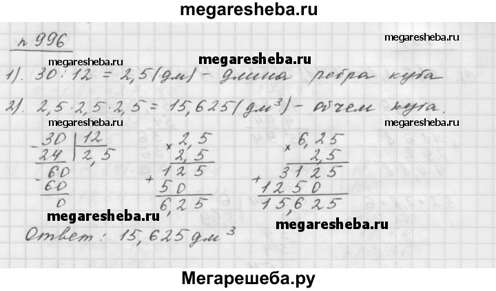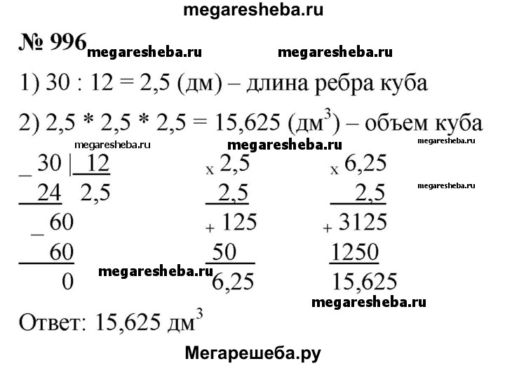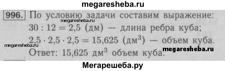 996. Найдите объём куба, сумма длин всех рёбер которого равна 30 дм.