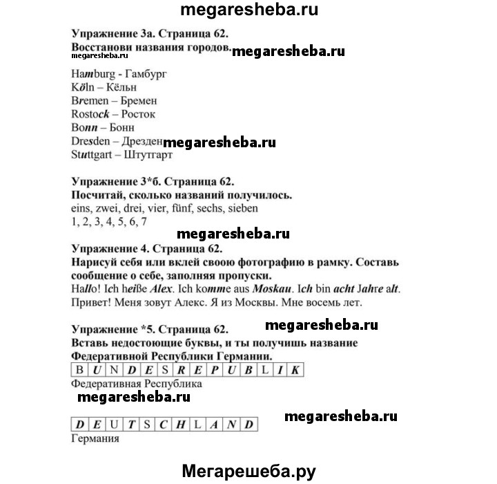 Подробный решебник (ГДЗ) по Немецкому языку за 2 (второй) класс рабочая тетрадь - готовый ответ часть 1. страница - 62. Авторы учебника: Бим, Рыжова. Издательство: Просвещение 2016.