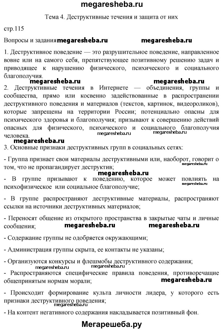 Подробный решебник (ГДЗ) по ОБЖ за 8‐9 (восьмой‐девятый) класс - готовый ответ часть 2. страница - 115. Авторы учебника: Рудаков, Шойгу, Приорова, Позднякова. Издательство: Просвещение 2023.