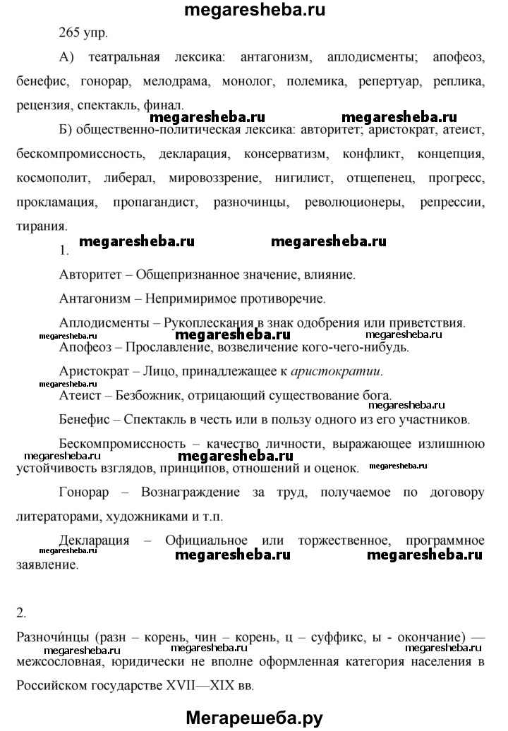 Подробный решебник (ГДЗ) по Русскому языку за 10‐11 (десятый‐одиннадцатый) класс - готовый ответ упражнения - 265. Авторы учебника: Власенков, Рыбченкова. Издательство: Просвещение 2009.