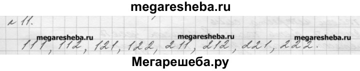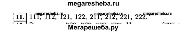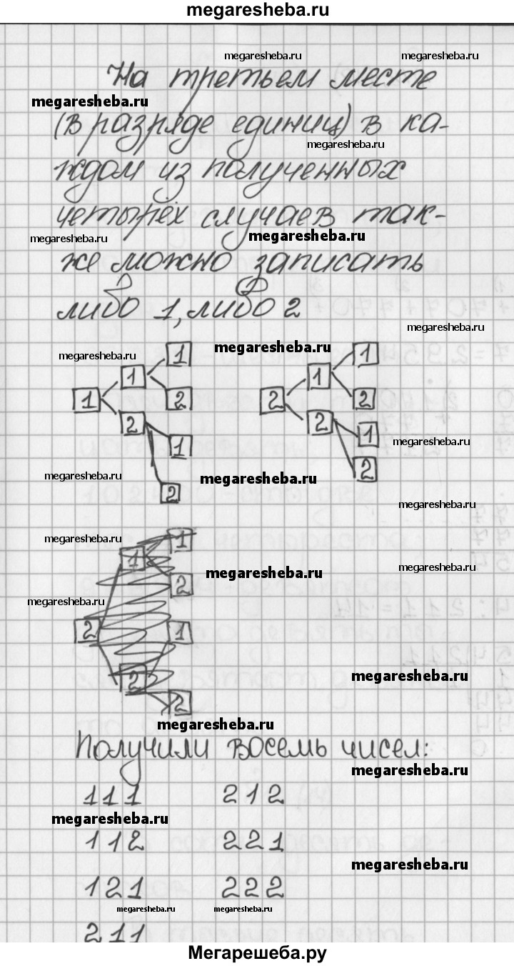 11. Запишите все все трёхзначные числа, для записи которых употребляются только цифры 1 и 2. Решение. В записи числа на первом слева месте (в разряде сотен) может стоять цифра 1 или цифра 2 На втором месте (в разряде десятков) в каждом случае также одна из двух цифр — 1 или 2: На третьем месте (в разряде единиц) в каждом из полученных четырёх случаев также можно записать либо 1, либо 2: Получили восемь чисел: 111, 112, 121, 122, 211, 212, 221, 222.