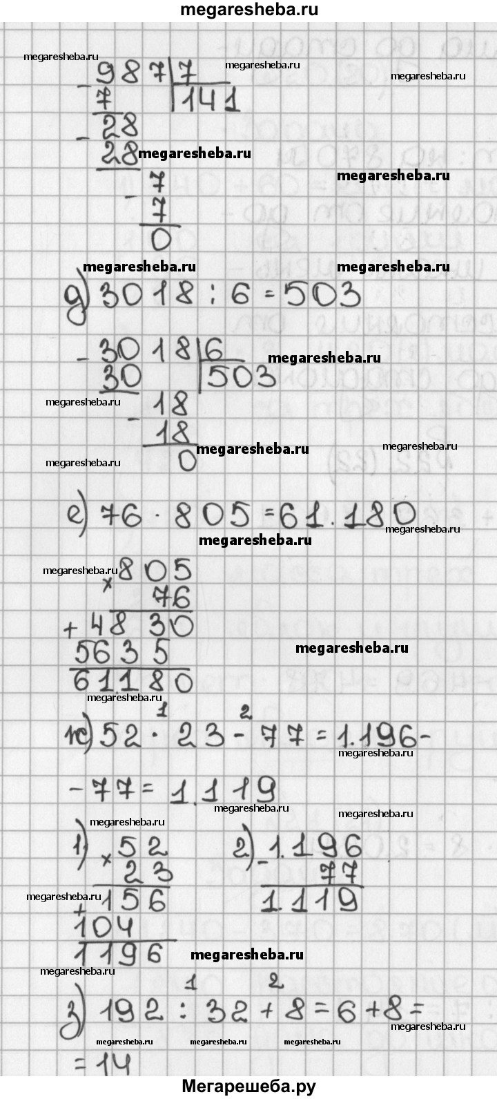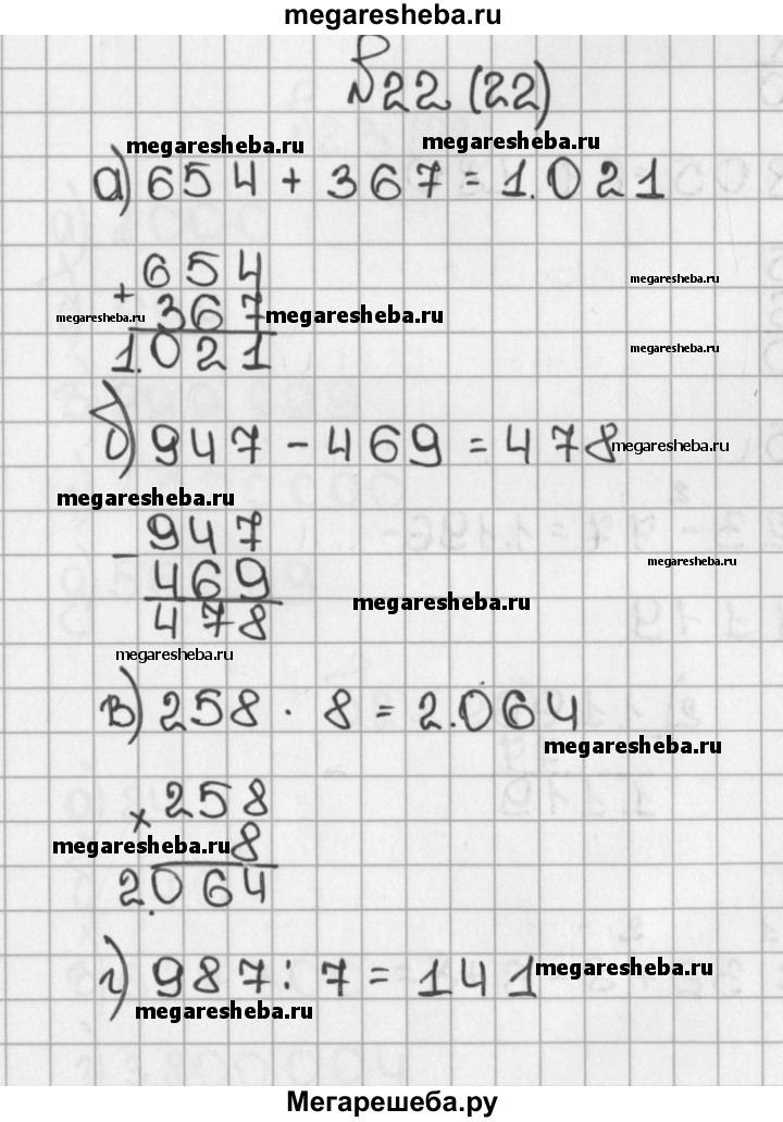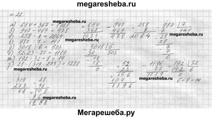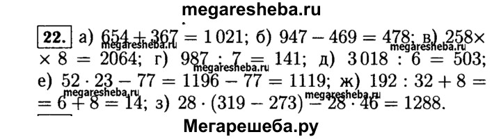 22. Выполните действия: а) 654 + 367; г) 987 : 7; ж) 192 : 32 + 8; б)947 - 469; д) 3018: 6; з) 28* (319 - 273). в) 258 * 8; е) 52 * 23 - 77;