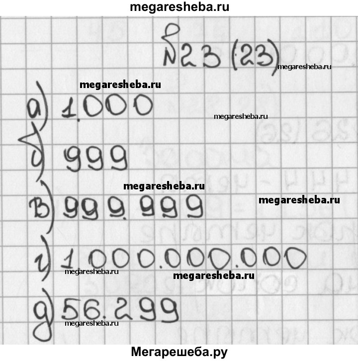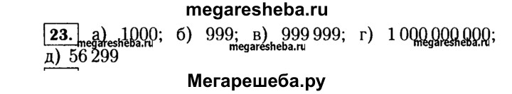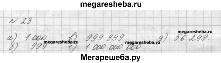 23. Запишите натуральное число: а) следующее за числом 999; б) на 1 меньшее 1000; в) предшествующее числу 1 000 000; г) на 1 большее числа 999 999 999; д) на 1 меньшее числа 56 300.
