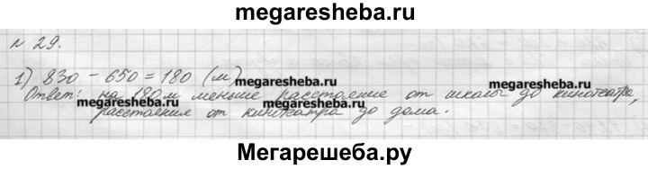 29. Расстояние от школы до кинотеатра 650 м, а от кинотеатра до дома 830 м. На сколько расстояние от школы до кинотеатра меньше расстояния от кинотеатра до дома?