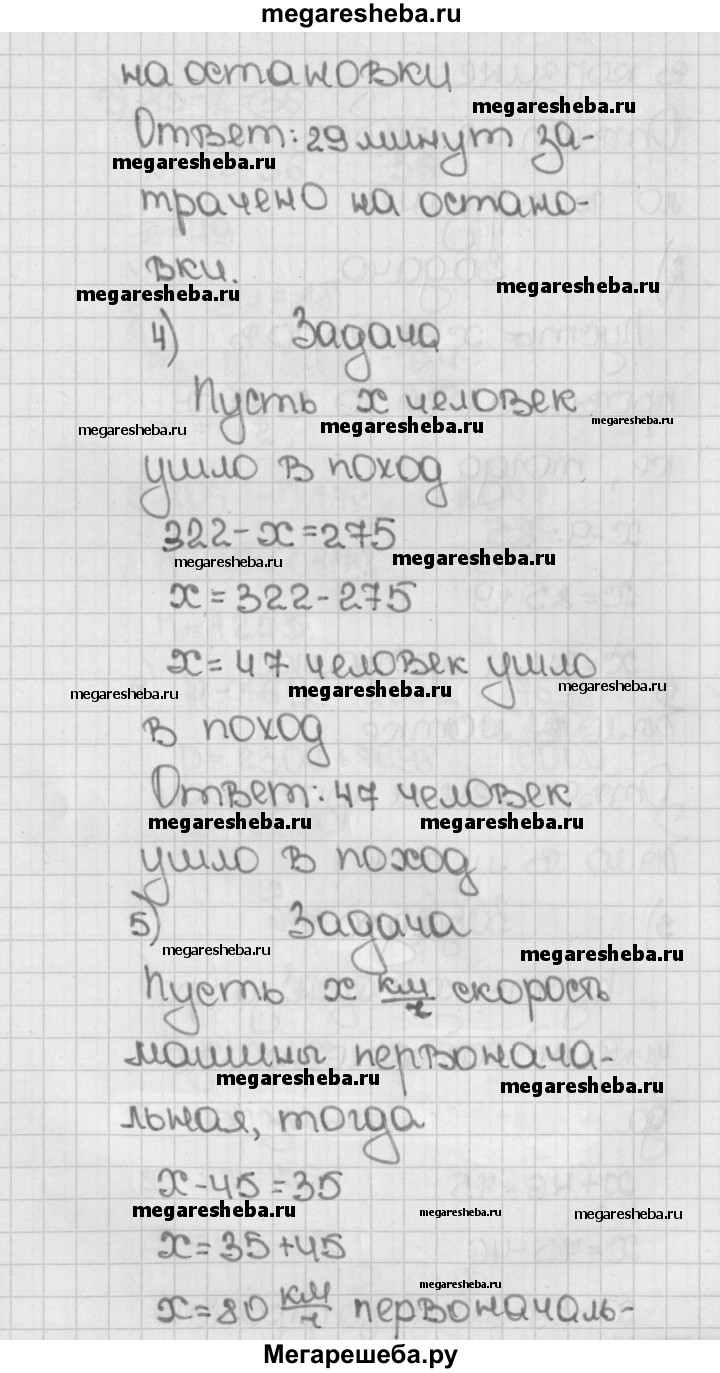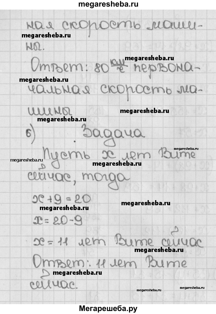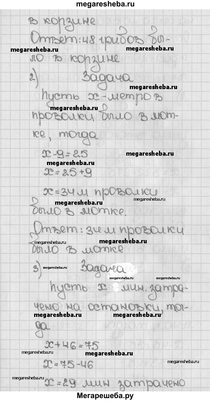 373. Решите с помощью уравнения задачу: а) В корзине было несколько грибов. После того как в неё положили ещё 27 грибов, их стало 75. Сколько грибов было в корзине? б) В мотке было несколько метров проволоки. После того как отрезали 9 м, осталось 25 м. Сколько метров проволоки было в мотке? в) Электропоезд был в пути 1 ч 15 мин. Некоторое время он затратил на остановки, а двигался 46 мин. Сколько времени затрачено на остановки? г) В спортивном лагере 322 человека. Когда несколько человек ушли в поход, в лагере осталось 275 человек. Сколько человек ушли в поход? д) Скорость автомашины уменьшили на 45 км/ч, и она стала равной 35 км/ч. Какова была скорость машины раньше? е) Через 9 лет Вите исполнится 20 лет. Сколько лет ему сейчас?