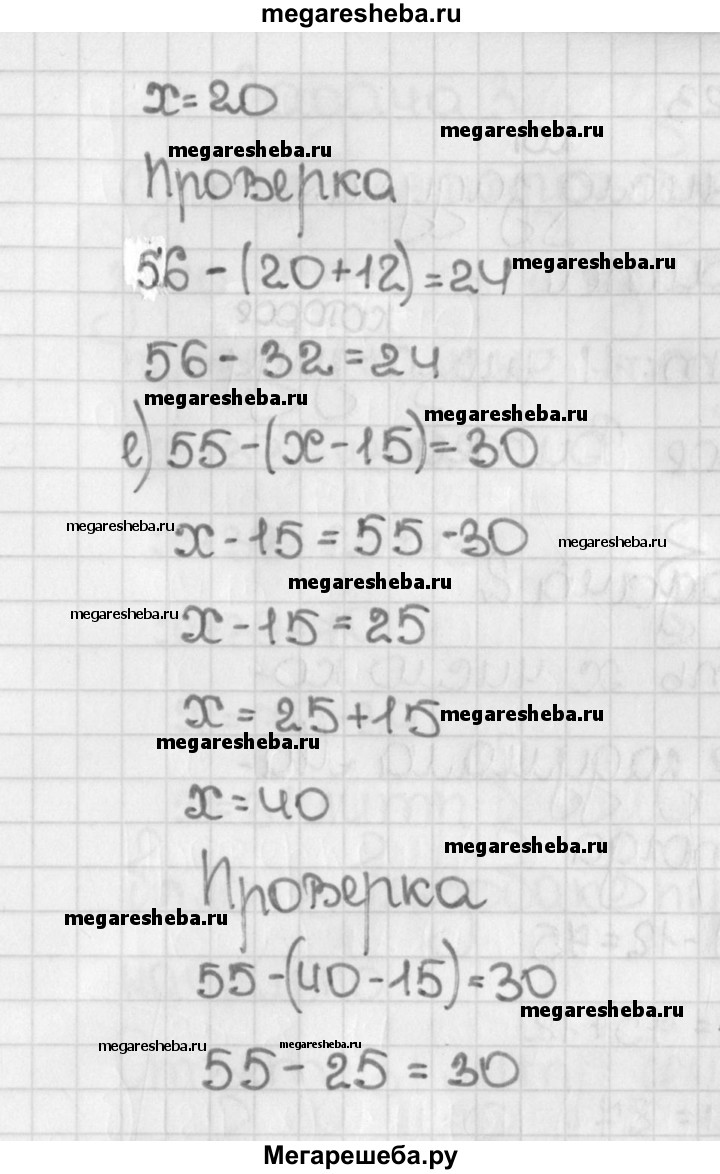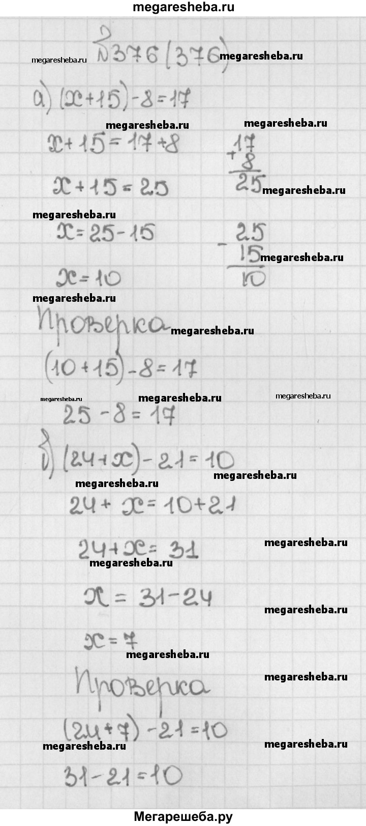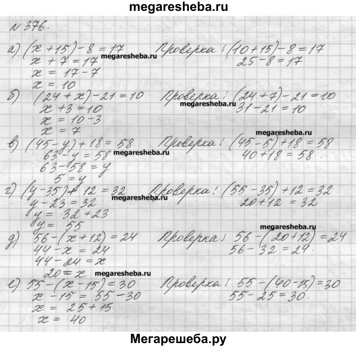 376. Решите уравнение и выполните проверку: а) (х + 15) - 8 = 17; г) (у - 35) + 12 = 32; б) (24 + х) - 21 = 10; д) 56 - (х + 12) = 24; в) (45 - у) + 18 = 58; е) 55 - (х - 15) = 30.