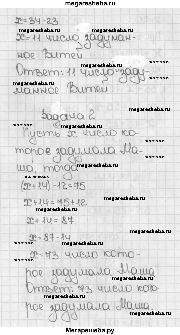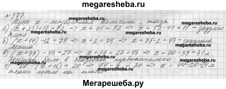 377. Решите с помощью уравнения задачу: а) Витя задумал число. Если к этому числу прибавить 23 и к полученной сумме прибавить 18, то будет 52. Какое число задумал Витя? б) Маша задумала число. Если к этому числу прибавить 14 и от полученной суммы отнять 12, то будет 75. Какое число задумала Маша? 61 в) В бензобак, где был бензин, перед поездкой долили ещё 39 л. Во время поездки израсходовали 43 л бензина, после чего в бензобаке осталось 27 л. Сколько литров бензина было в бензобаке первоначально? г) В ателье было 60 м ткани. Из неё сшили платья, ещё 16 м израсходовали на детские костюмы, после чего осталось 20 м этой ткани. Сколько метров ткани пошло на платья?