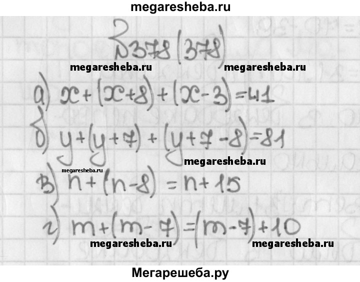 378. Запишите в виде равенства: а) У Вани было х яблок, у Пети — на 8 яблок больше, а у Нины — на 3 яблока меньше, чем у Вани. Вместе у них было 41 яблоко. б) Один токарь выточил у деталей, другой — на 7 деталей больше, чем первый, а третий — на 8 деталей меньше, чем второй. Вместе они сделали 81 деталь. в) У Кости п открыток, у Игоря — на 8 открыток меньше, чем у Кости, а у Наташи — на 15 открыток больше, чем у Кости. У Наташи столько же открыток, сколько у Кости и Игоря вместе. г) В первый сосуд налили тп л жидкости, во второй — на 7 л меньше, чем в первый, а в третий сосуд — на 10 л больше, чем во второй. В третьем сосуде оказалось столько жидкости, сколько в первом и втором сосудах вместе.