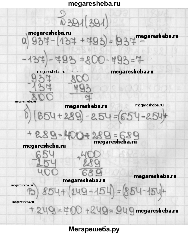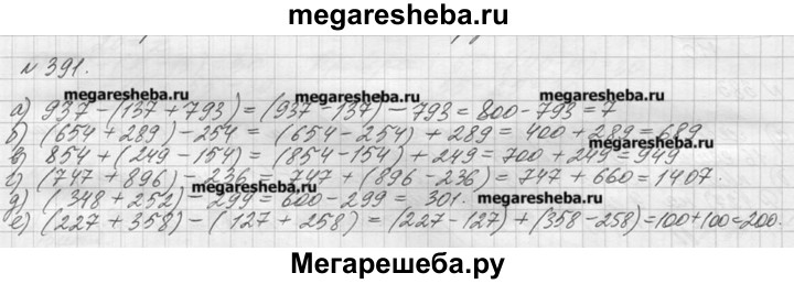 391. Вычислите, выбирая удобный порядок выполнения действий: а) 937 - (137 + 793) б) (654+ 289) - 254 в) 854 + (249 - 154) г) (747 + 896) - 236; д) (348 + 252) - 299; е) (227 + 358) - (127 + 258).