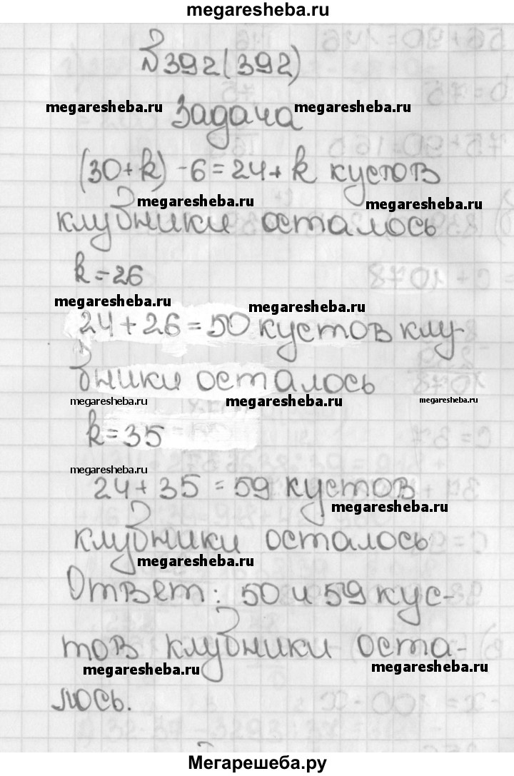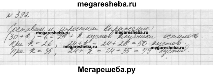 392. На одной грядке посадили 30 кустов клубники, а на другой k кустов. Погибло 6 кустов. Сколько кустов клубники осталось на грядках? Составьте выражение для решения задачи и найдите его значение при k = 26; 35.