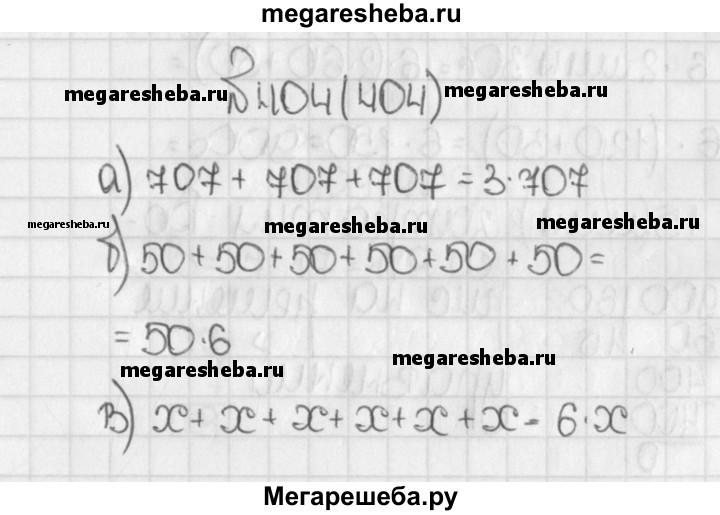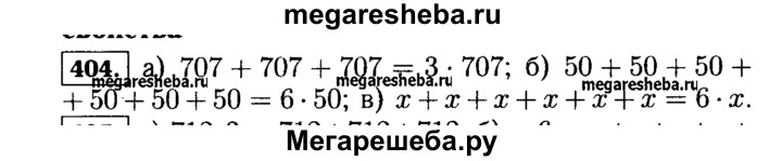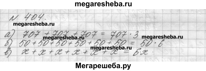 404. Представьте в виде произведения сумму: а) 707 + 707 + 707; б) 50 + 50 + 50 + 50 + 50 + 50; в) х + х + x: + x: + x: + х.
