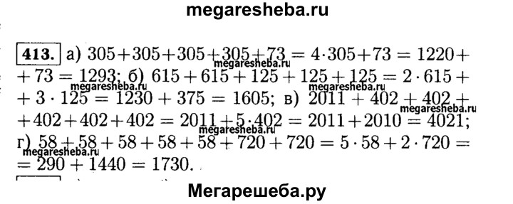 413. Найдите значение выражения а) 305 + 305 + 305 + 305 + 73 б) 615 + 615 + 125 + 125 + 125; в) 2011 + 402 + 402 + 402 + 402 + 402; г) 58 + 58 + 58 + 58 + 58 + 720 + 720.