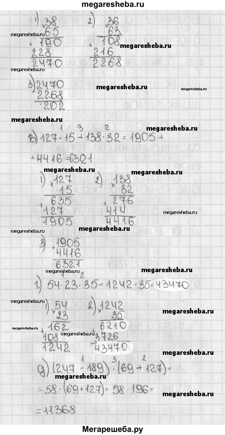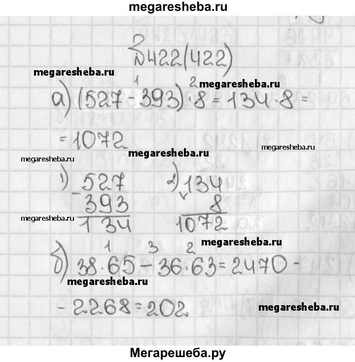 422. Выполните действия: а) (527 - 393) * 8; г) 54 * 23 * 35; б) 38 * 65 - 36 * 63; д) (247 - 189) * (69 + 127); в) 127 * 15 + 138 * 32; е) (1203 + 2837 - 1981) * 21.