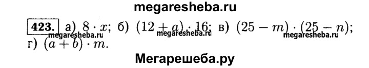 423. Запишите произведение: а) 8 и х; б) 12 + а и 16; в) 25 - m и 28 + п; г) а + b и m.