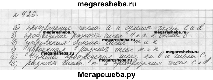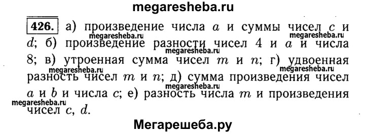 426. Прочитайте выражение: а) а * (с + d); в) 3(m + n); д) ab + с; б) (4 - а) * 8; г) 2(m - n); е) m - cd.