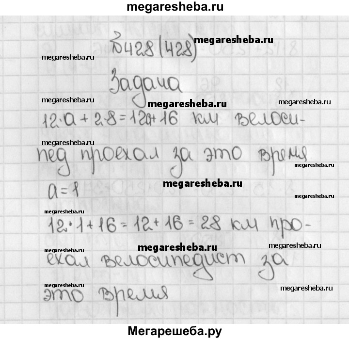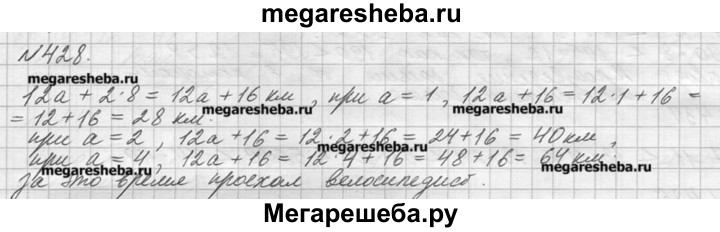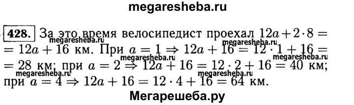 428. Велосипедист ехал а ч со скоростью 12 км/ч и 2 ч со скоростью 8 км/ч. Сколько километров проехал велосипедист за это время? Составьте выражение для решения задачи и найдите его значение при а = 1; 2; 4.