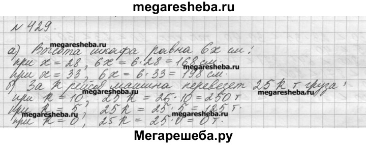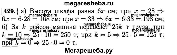 429. Составьте выражение по условию задачи: а) Из 6 книжных полок составлен шкаф. Высота каждой полки х см. Найдите высоту шкафа. Найдите значение выражения при х = 28; 33. б) За один рейс автомашина МАЗ-25 перевозит 25 т груза. Сколько груза она перевезёт за k рейсов? Найдите значение выражения при k = 10; 5; 0.