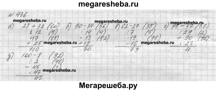 436. Вычислите устно: а) 28 + 32 : 12 * 17 + 25/? б) 90 - 34 : 14 * 13 + 18/? в) 62-27:7*19-16/? г) 95 - 37 : 29 + 90 : 23/? д) 100 - 8 : 2 - 45 * 47/?