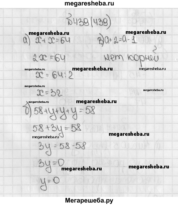 439. Угадайте корни уравнения: а) х + х = 64; б) 58 + у + у + у = 58; в) а + 2 = а - 1.