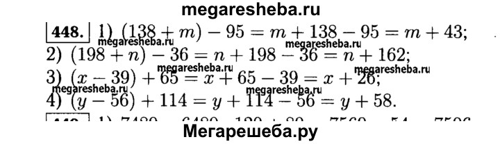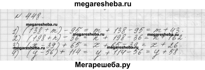 448. Упростите выражение: 1) (138 + m) - 95; 3) (х - 39) + 65; 2) (198 + n) - 36; 4) (у-56) + 114.