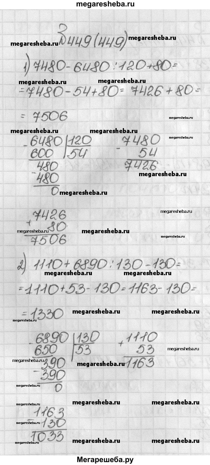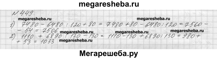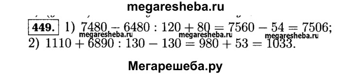 449. Найдите значение выражения: 1) 7480 - 6480 : 120 + 80; 2) 1110 + 6890 : 130 - 130.