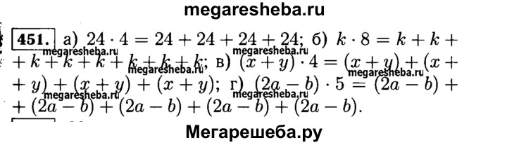 451. Представьте в виде суммы произведение: а) 24*4; б) k * 8; в) (х + у) * 4; г) (2а - Ь) * 5.