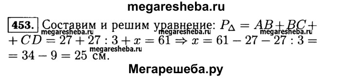 453. В треугольнике АБС сторона АВ равна 27 см, и она больше стороны ВС в 3 раза. Найдите длину стороны АС, если периметр треугольника ABC равен 61 см.