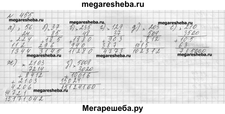 455. Выполните умножение: а) 56 * 24; в) 235 * 48; д) 203 * 504; ж) 2103 * 7214; б) 37 * 85; г) 37 * 129; е) 210 * 3500; з) 5008 * 3020.