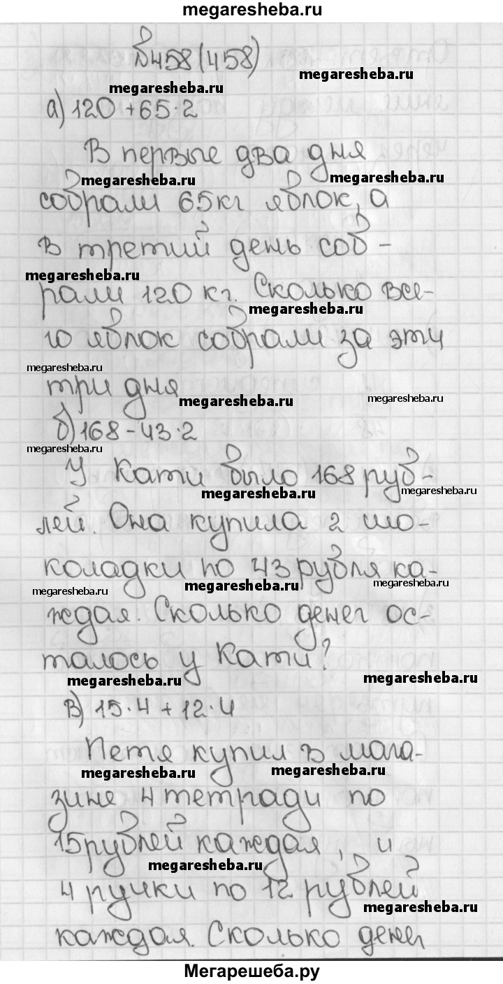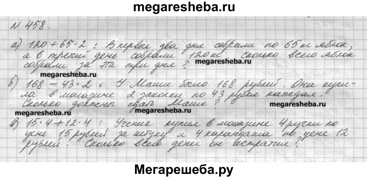 458. Придумайте задачу по выражению: а) 120 + 65*2; б) 168 - 43-2; в) 15 * 4 + 12 * 4.