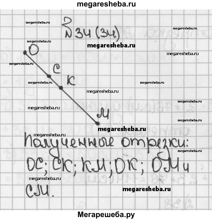 34. Начертите отрезок ОМ и отметьте на нём точки С и К. Запишите все получившиеся отрезки с концами в точках О, С, К и М.