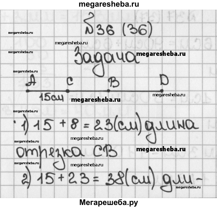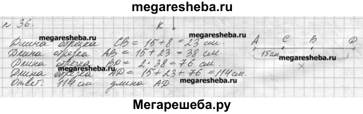 36. На отрезке AD отмечены точки С и Б так, что С лежит между точками Л и В. Найдите длину отрезка AD, если длина отрезка АС равна 15 см, длина отрезка СВ на 8 см больше длины отрезка АС, а длина отрезка BD в 2 раза больше длины отрезка АВ.