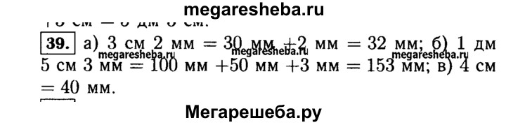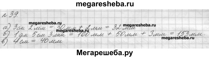 39. Выразите в миллиметрах: а) 3 см 2 мм; б) 1 дм 5 см 3 мм; в) 4 см.
