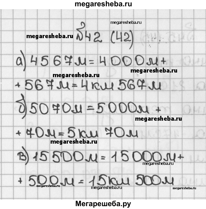 42. Выразите в километрах и метрах: а) 4567 м; б) 5070 м; в) 15 500 м.