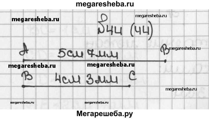 44. Начертите отрезки АВ и ВС, где АВ = 5 см 7 мм, ВС = 4 см 3 мм.