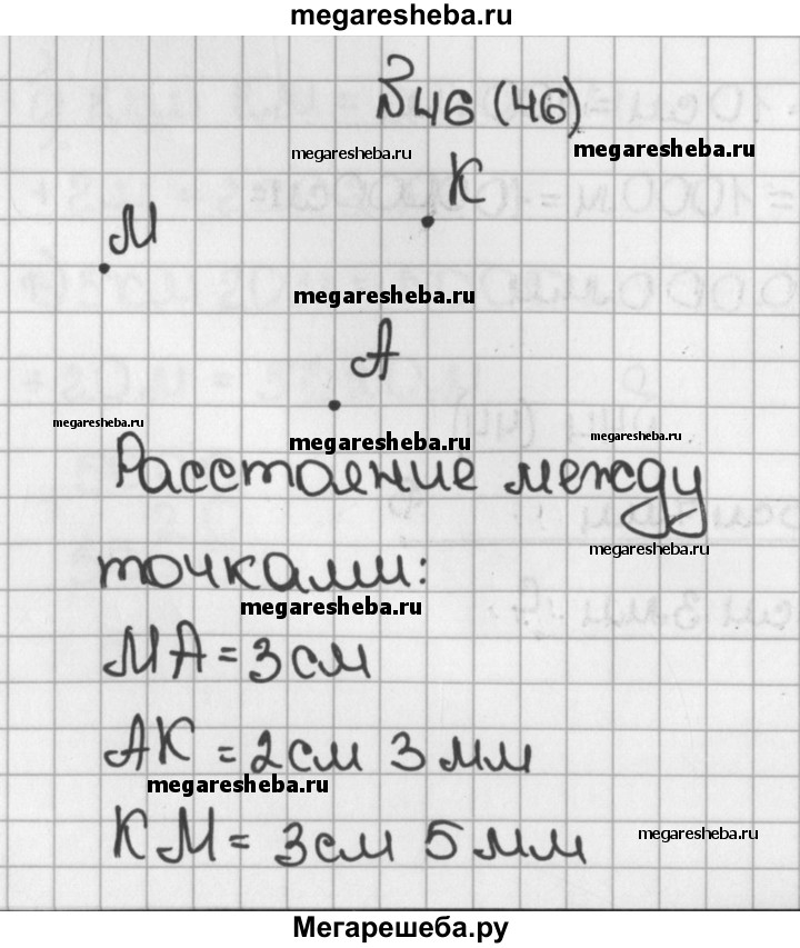 46. Отметьте в тетради точки М, А и К. Измерьте расстояния между точками М и А, А и К, К и М. Запишите результаты измерений.