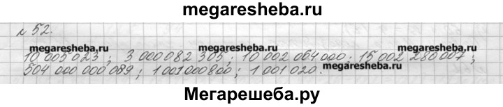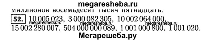52. Запишите цифрами числа: десять миллионов пять тысяч двадцать три; три миллиарда восемьдесят две тысячи триста пять; десять миллиардов два миллиона шестьдесят четыре тысячи; пятнадцать миллиардов два миллиона двести восемьдесят тысяч семь; пятьсот четыре миллиарда восемьдесят девять; один миллиард один миллион восемьсот; один миллион одна тысяча двадцать.