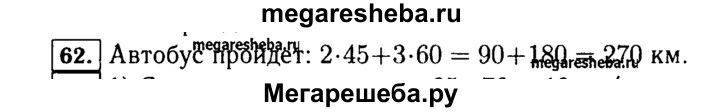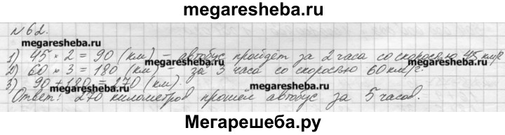 62. Автобус шёл 2 ч со скоростью 45 км/ч и 3 ч со скоростью 60 км/ч. Какой путь прошёл автобус за эти 5 ч?