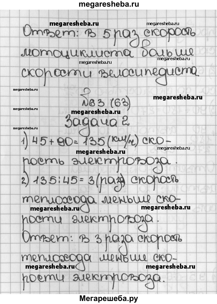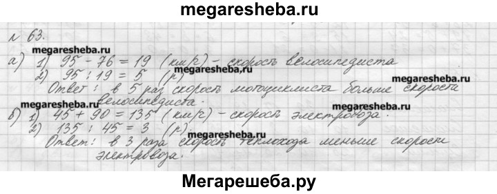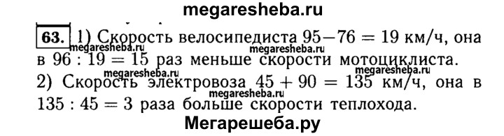 63. Решите задачу: 1) Мотоциклист едет со скоростью 95 км/ч, а скорость велосипедиста на 76 км/ч меньше. Во сколько раз скорость мотоциклиста больше скорости велосипедиста? 2) Скорость теплохода 45 км/ч, а скорость электровоза на 90 км/ч больше. Во сколько раз скорость теплохода меньше скорости электровоза?