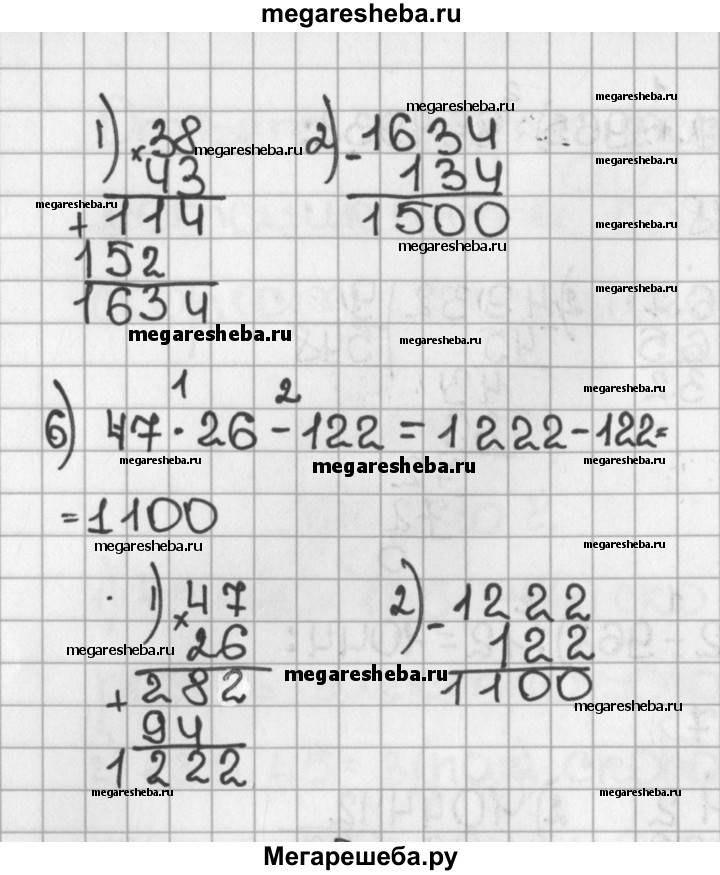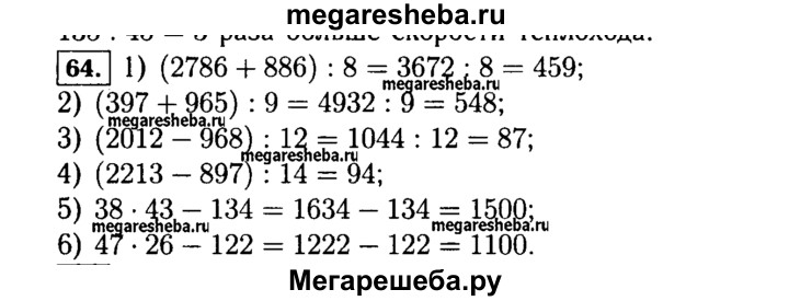 64. Выполните действия: 1) (2786 + 886) : 8; 3) (2012 - 968) : 12; 5)38*43 - 134; 2) (3967 + 965) : 9; 4) (2213 - 897) : 14; 6)47*26 - 122.