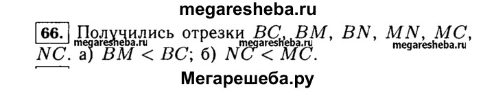 66. Начертите отрезок ВС и отметьте на нём точки М и N так, чтобы точка М лежала между точками В и N. Запишите все получившиеся отрезки с концами В, М, N и С. Сравните отрезки: а) ВМ и ВС; б) NC и МС.
