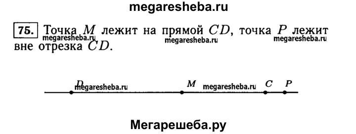 75. Отметьте в тетради точки С и D и проведите прямую CD. Отметьте на отрезке CD точку М. Лежит ли эта точка на прямой CD? Отметьте точку Р на прямой CD, не лежащую на отрезке CD.