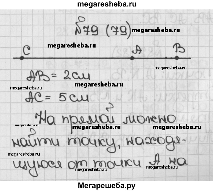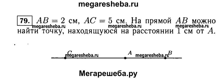 79. Отметьте точки А и В на расстоянии 2 см друг от друга. Проведите через эти точки прямую и отложите на ней отрезок АС длиной в 5 см так, чтобы точки В и С были по разные стороны от точки А. Есть ли на прямой точка, находящаяся от точки А на расстоянии 1 см?