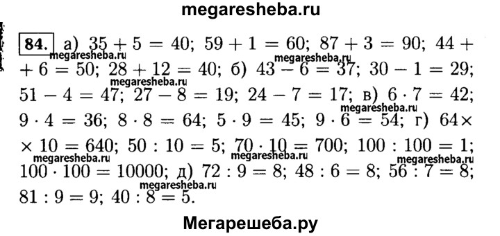 84. Вычислите устно: 35 + 5; б) 43 -6; в) 6*7; г) 64 *10; Д) 72:9; 59 + 1; 30 -1; 9*4; 50 :10; 48:6; 87 + 3; 51 -4; 8*8; 70 *10; 56:7; 44 + 6; 27 -8; 5*9; 100: 100; 81:9; 28 + 12; 24 -7; 9*6; 100* 100; 40:8.