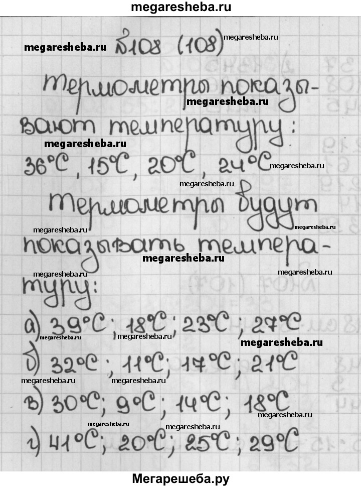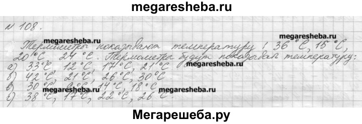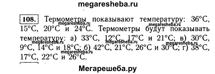 108. Какую температуру показывает каждый термометр на рисунке 24? Какую температуру будут показывать эти термометры, если их столбики: а) опустятся на 3 деления; б) поднимутся на 6 делений; в) опустятся на 6 делений; г) поднимутся на 2 деления?